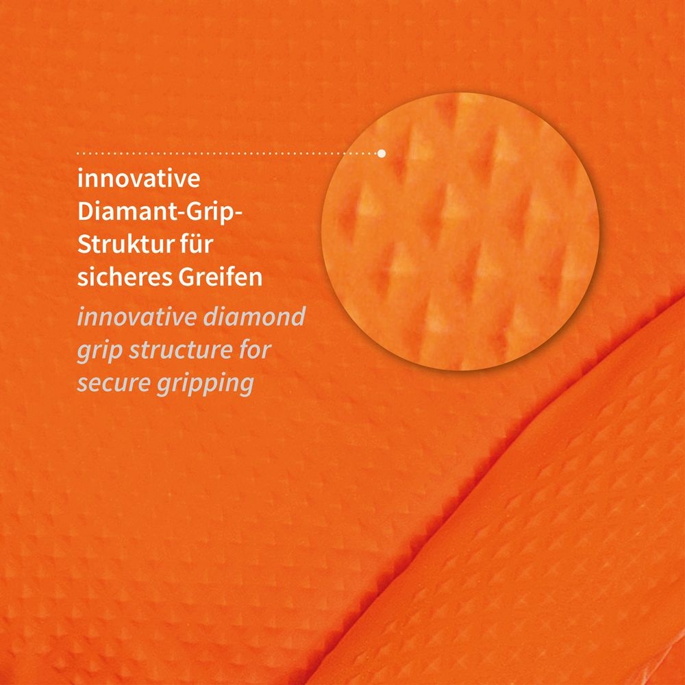 Die Nitrilhandschuhe Diamond Grip von Franz Mensch sind Premium-Einmalhandschuhe, entwickelt für anspruchsvolle Tätigkeiten unter Extrembedingungen. Sie bestehen aus extra starkem, schwerem Nitril und verfügen über eine vollflächige Diamant-Grip-Textur. Das macht sie außergewöhnlich griffig – selbst bei Nässe, Öl und Fett.