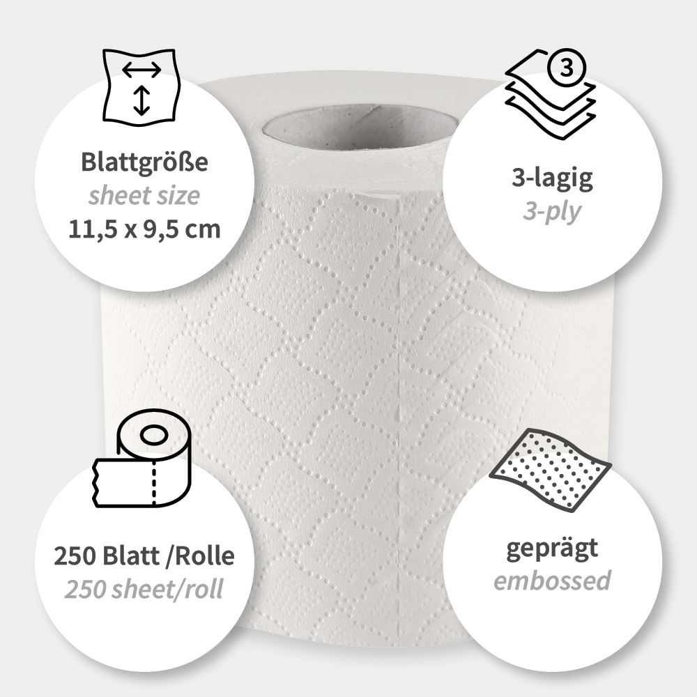 3-lagiges Toilettenpapier ist das beliebteste unter den Toilettenpapieren. Um das Lieblingspapier unserer Kunden noch nachhaltiger anzubieten, gibt es das Toilettenpapier 3-lagig als FSC®-Mix-zertifizierte Variante. Das Papier besteht aus reiner Zellulose, die aus vorbildlich bewirtschafteten Wäldern sowie anderen kontrollierten Quellen stammt. Toilettenpapier aus Zellulose ist sehr saugfähig und dank der 3 Lagen angenehm weich. Die geprägte Oberfläche und die hohe Qualität der Zellulose sorgen für eine gute Saugkraft und Stabilität. Die Kleinrolle umfasst 250 Blatt pro Rolle und passt in die gängigen Toilettenpapierhalter.