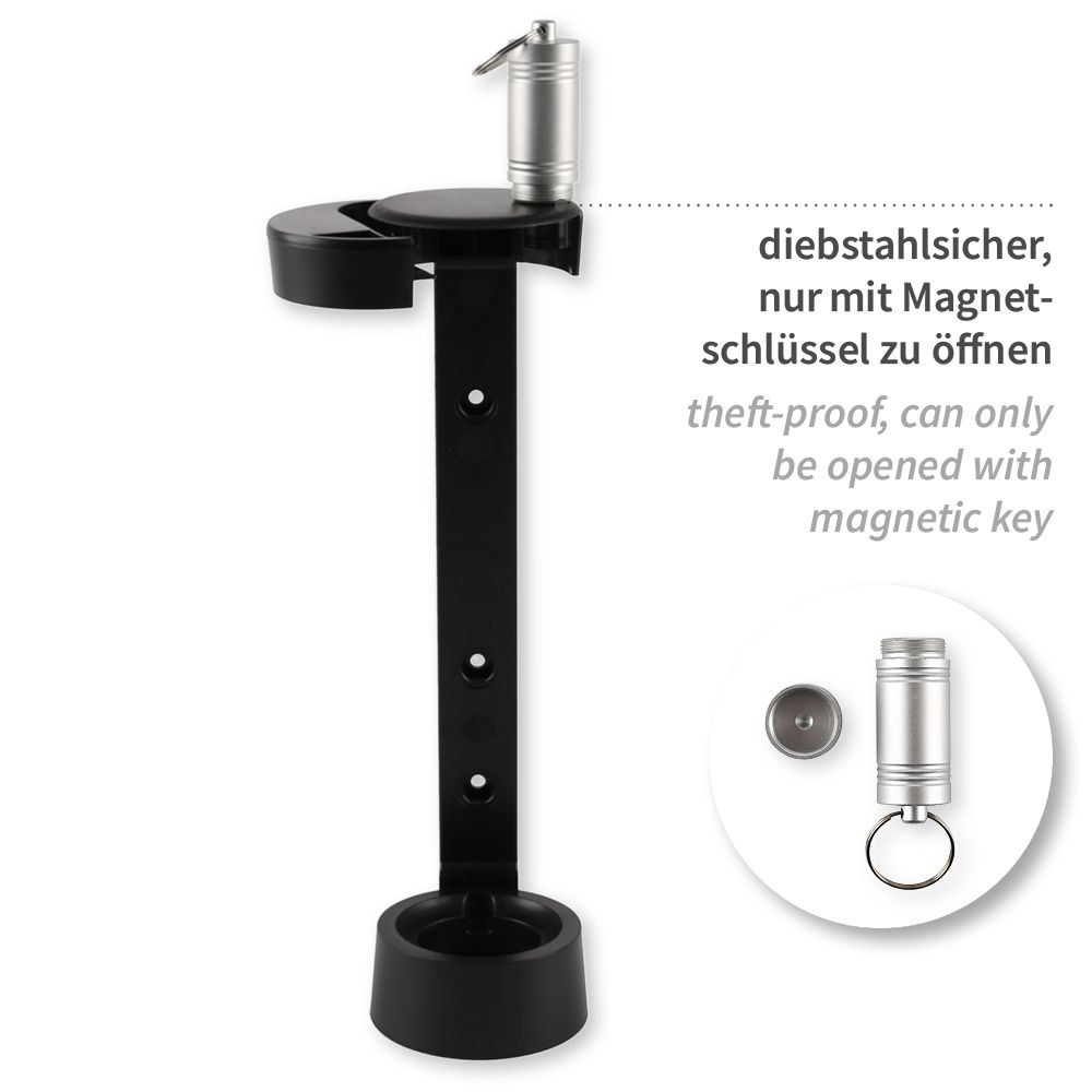 Durch die flexible Montageoption lässt sich der Wandhalter entweder fest anschrauben oder einfach mit den mitgelieferten Klebestreifen befestigen, was ihn auch für Mietobjekte mit empfindlichen Oberflächen attraktiv macht. Die Flasche kann nur mit dem mitgelieferten Magnetschlüssel entnommen werden, wodurch ein hohes Maß an Diebstahlschutz gewährleistet ist. Diese praktische Wandhalterung ist in den Farben Weiß oder Schwarz erhältlich und wird inklusive aller benötigten Montagematerialien ausgeliefert, sodass die Installation besonders einfach und schnell gelingt.